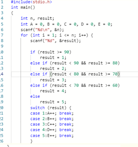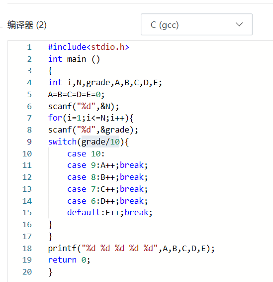 本题变量:int整形 i,N,grade,A,B,C,D,E;