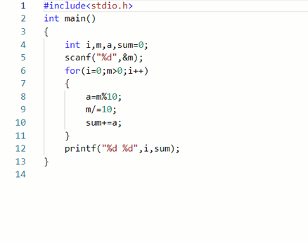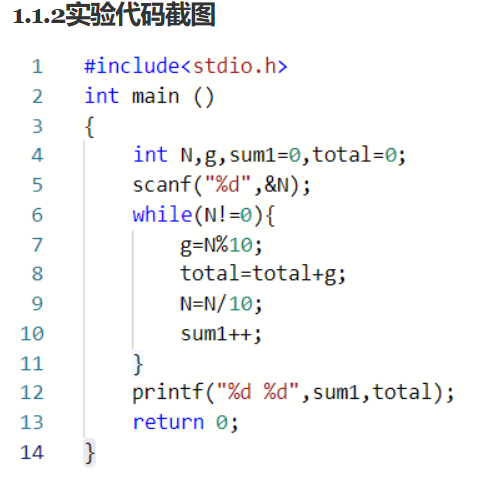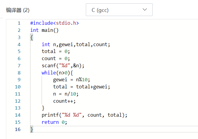 接收N,利用while语句根据gewei = n%10;total = total+gewei;n = n/10;count++;求得结果。