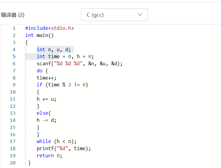 本题使用do-while语句,先执行一次do{},利用基数时间向上爬,偶数向下爬来解决此题。