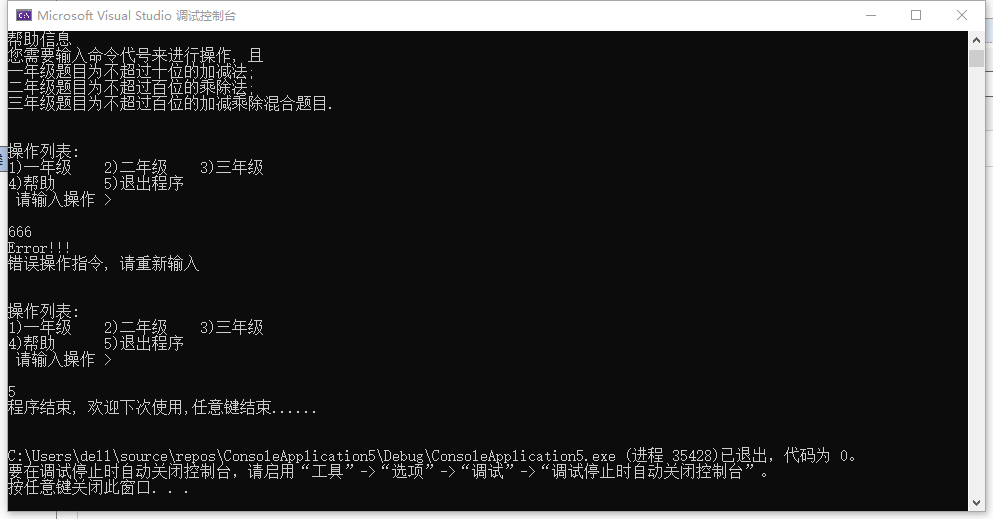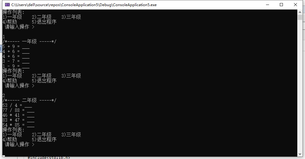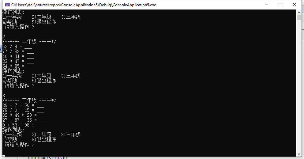 printf("一年级题目为不超过十位的加减法;\n二年级题目为不超过百位的乘除法;\n三年级题目为不超过百位的加减乘除混合题目.\n\n\n");