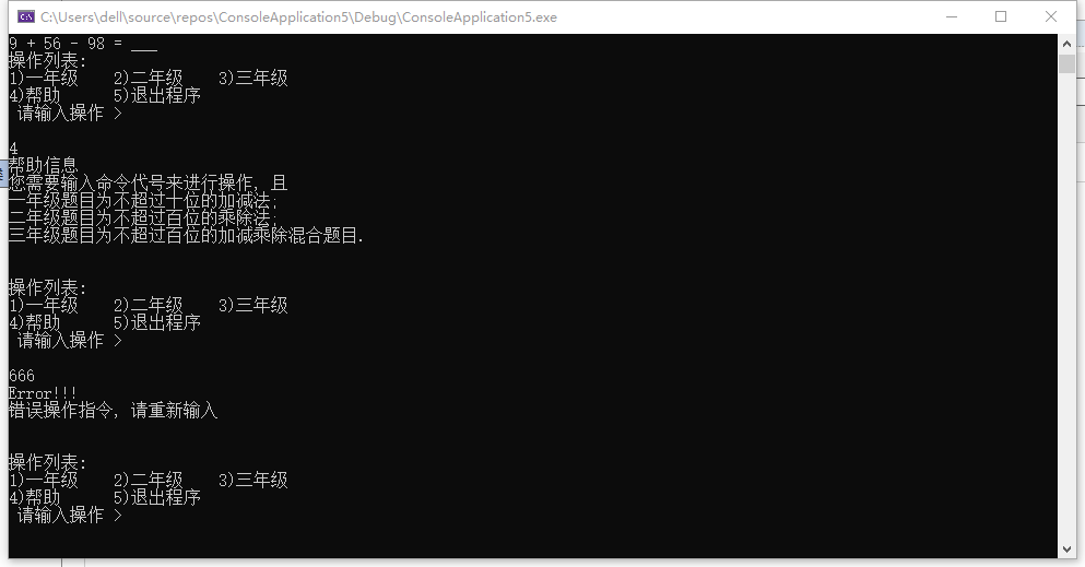 printf("操作列表:\n1)一年级 2)二年级 3)三年级\n4)帮助 5)退出程序\n ");