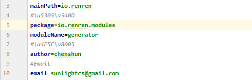 2.2修改application.properties(mainPath主路径 package包名 moduleName模块名)最终的包名为package.moduleName.xx,另外可修改
