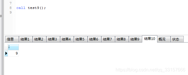 create procedure test3() begin begin declare userscount int default 0; -- 用户表中的数量 declare ordercount int default 0; -- 订单表中的数量 select count(*) into userscount from users; select count(*) into ordercount from orders; select userscount,ordercount; -- 返回用户表中的数量、订单表中的数量 end; begin declare maxmoney int default 0; -- 最大金额 declare minmoney int default 0; -- 最小金额 select max(money) into maxmoney from orders; select min(money) into minmoney from orders; select maxmoney,minmoney; -- 返回最金额、最小金额 end; end;
