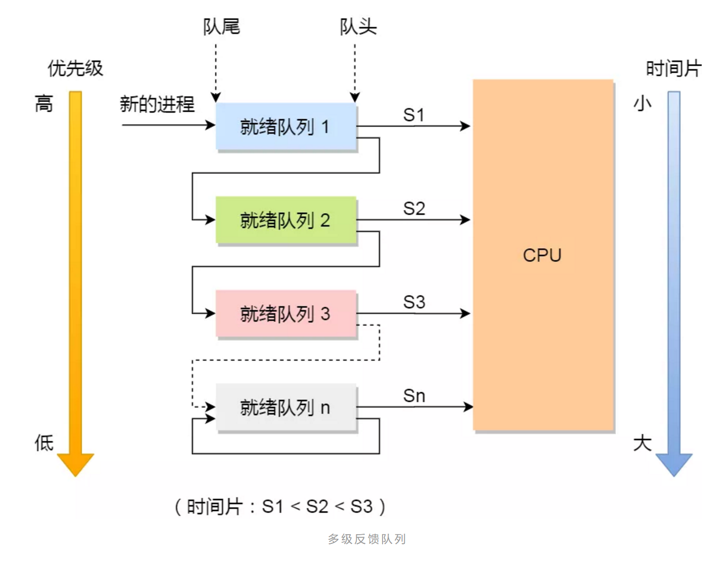 - 对于同一个队列中的各个进程,按照时间片轮转法调度。比如Q1队列的时间片为N,那么Q1中的作业在经历了时间片为N的时间后,若还没有完成,则进入Q2队列等待,若Q2的时间片用完后作业还不能完成,一直进入下一级队列,直至完成。