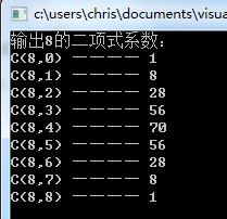 cout<<"C"<<"("<<8<<","<<i <<")"<<" ———— "<<result[8][i]<<endl;