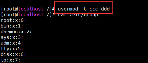9. usermod -G ccc ddd 将用户ddd加入ccc所属组的用户列表中