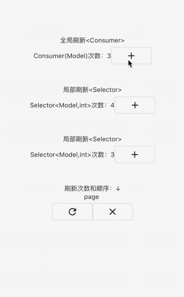 Widget build(BuildContext context) { print('page 1'); _string += 'page '; return Scaffold( appBar: AppBar( title: Text('Provider 全局与局部刷新'), ), body: Center( child: Column( mainAxisAlignment: MainAxisAlignment.center, crossAxisAlignment: CrossAxisAlignment.center, children: <Widget>[ Text('全局刷新<Consumer>'), Consumer<ProviderModel>( builder: (BuildContext context, ProviderModel value, Widget child) { print('Consumer 0 刷新'); _string += 'c0 '; return _Row( value: value._count.toString(), callback: () { context.read<ProviderModel>().plus(); }, ); }, child: _Row( value: '0', callback: () { context.read<ProviderModel>().plus(); }, ), ), SizedBox( height: 40, ), Text('局部刷新<Selector>'), Selector<ProviderModel, int>( builder: (ctx, value, child) { print('Selector 1 刷新'); _string += 's1 '; return Row( mainAxisAlignment: MainAxisAlignment.center, children: <Widget>[ Text('Selector<Model,int>次数:' + value.toString()), OutlineButton( onPressed: () { context.read<ProviderModel>().plus2(); }, child: Icon(Icons.add), ) ], ); }, selector: (ctx, model) => model._count2, shouldRebuild: (m1, m2) { print('s1:$m1 $m2 ${m1 != m2 ? '不相等,本次刷新' : '数据相等,本次不刷新'}'); return m1 != m2; }, ), SizedBox( height: 40, ), Text('局部刷新<Selector>'), Selector<ProviderModel, int>( selector: (context, model) => model._count3, shouldRebuild: (m1, m2) { print('s2:$m1 $m2 ${m1 != m2 ? '不相等,本次刷新' : '数据相等,本次不刷新'}'); return m1 != m2; }, builder: (ctx, value, child) { print('selector 2 刷新'); _string += 's2 '; return Row( mainAxisAlignment: MainAxisAlignment.center, children: <Widget>[ Text('Selector<Model,int>次数:' + value.toString()), OutlineButton( onPressed: () { ctx.read<ProviderModel>().plus3(); }, child: Icon(Icons.add), ) ], ); }, ), SizedBox( height: 40, ), Text('刷新次数和顺序:↓'), Text(_string), Row( mainAxisAlignment: MainAxisAlignment.center, children: <Widget>[ OutlineButton( child: Icon(Icons.refresh), onPressed: () { setState(() { _string += '\n'; }); }, ), OutlineButton( child: Icon(Icons.close), onPressed: () { setState(() { _string = ''; }); }, ) ], ) ], ), ), ); }