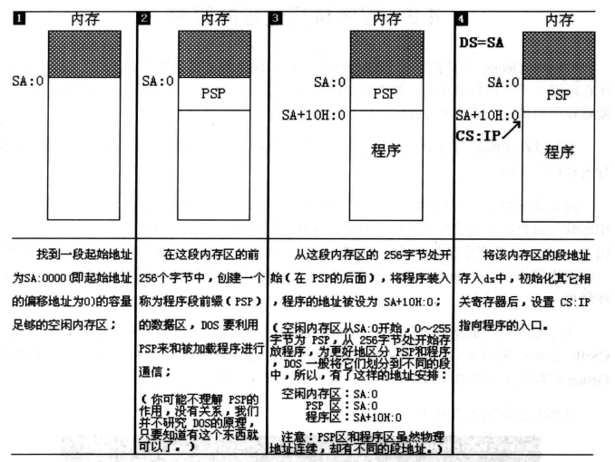 (1)首先在内存中找到足够的空闲内存区M,其地址为SA:0,即偏移地址为0,地址存放在了DS中。