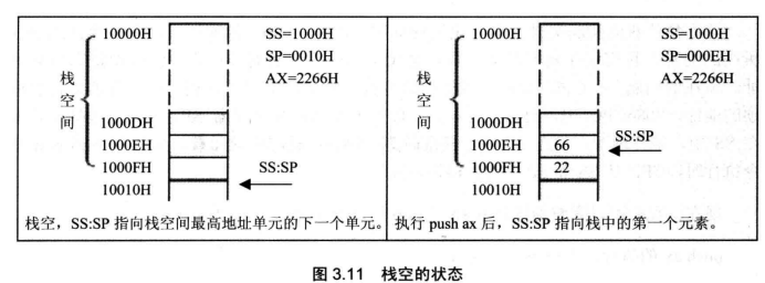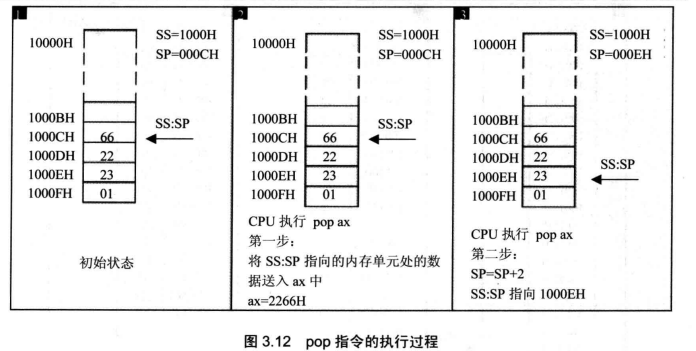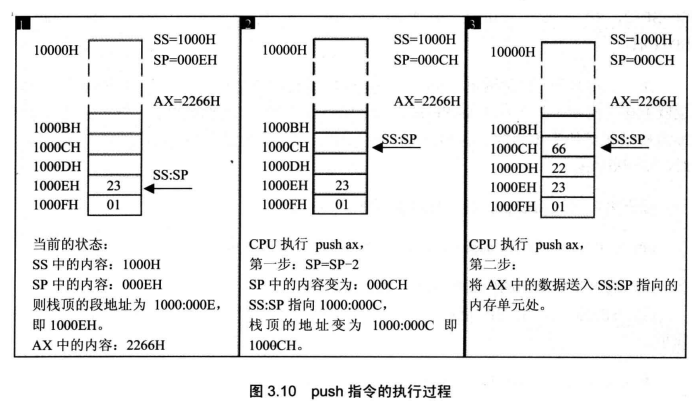 ax中的内容送入SS:SP指向的内存单元处,此时SS:SP指向新栈顶1000CH。