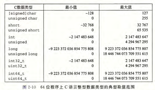 图2-14可以看到,32位字长的情况下,无符号形式的4294967296(UMax32)和补码形式的-1的位模式是完全一样的。也就是说将unsigned强制类型转换成int,底层的位表示保持不变。