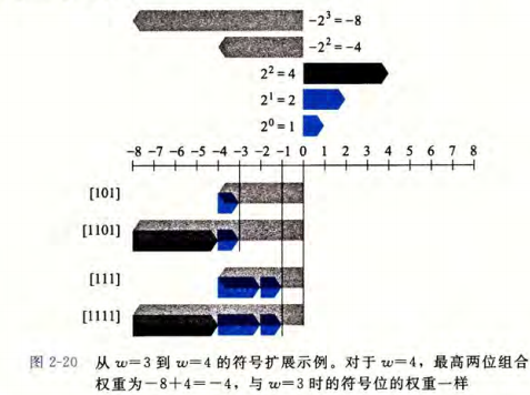 - 补码数字转换为一个更大的数据类型,在表示中添加最高有效位的值,叫做符号扩展(sign extension):