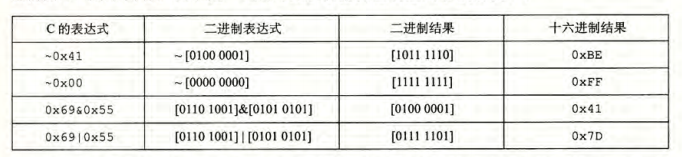 - 位级运算只有在参数被限制为0或者1时,才和逻辑运算有相同的行为。