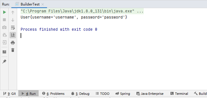 public class BuilderTest { public static void main(String args[]){ //构建对象 User user = Builder.of(User::new) .with(User::setUsername, "username") .with(User::setPassword, "password") .build(); System.out.println(user); } }
