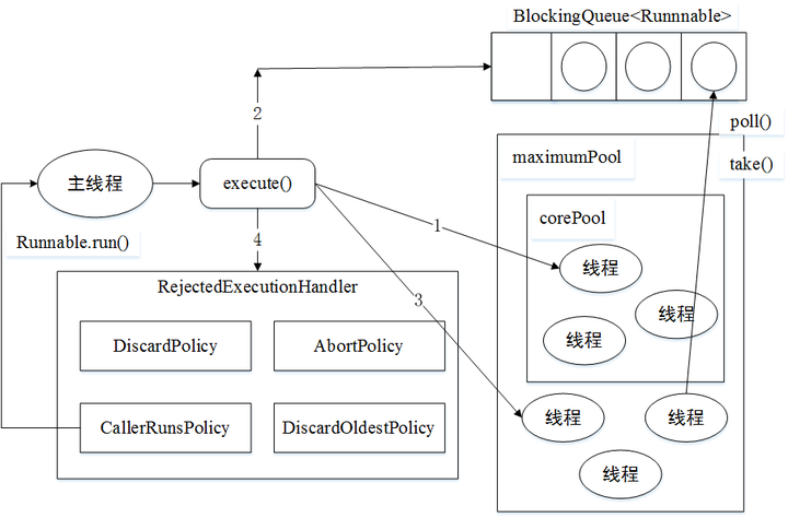 corePoolSize,判断阻塞队列workQueue是否已满,若未满,则将新任务添加进阻塞队列 - 若满,再判断,线程池中线程数是否达到阈值