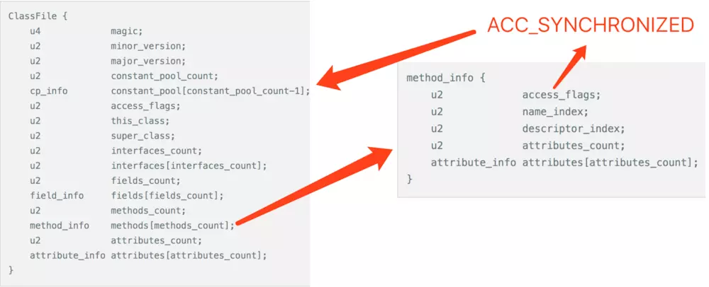 可以看到ACC_SYNCHRONIZED标识存放在常量池中,而method_info结构体中的access_flags字段是u2的,所以它只是一个指向常量池的标记。而常量池在加载时就会加载到运行时常量池中。