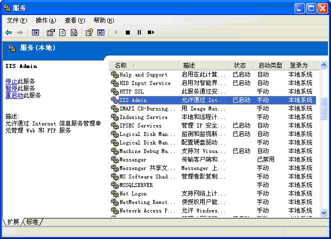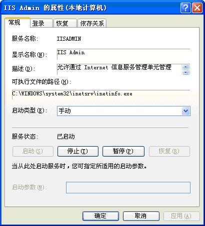 在这些服务中,有我们最熟悉的IIS Admin和World Wide Web Publishing服务了。我们双击一个服务项目即可打开服务属性对话框。