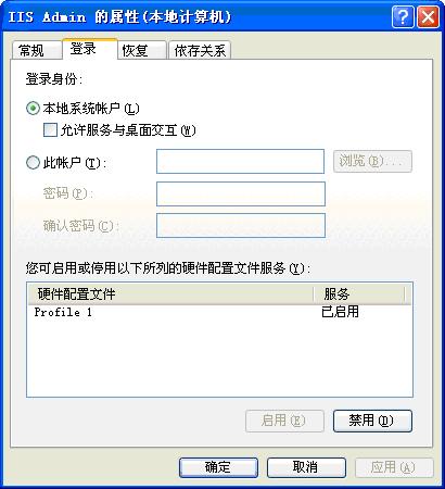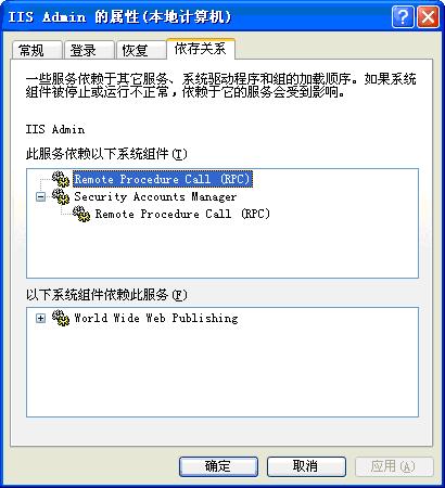 各个Windows服务之间可能存在依赖关系,比如IISADMIN服务就依赖另外一个名为RPC的Windows服务,当启动一个Windows服务时,系统会启动该服务所依赖的其他Windows服务。例如我们设置IISADMIN服务为自动启动,而RPC服务为手动启动,则Windows启动后会试图自动启动IISADMIN服务,结果会首先启动RPC服务,即使RPC服务不是自动启动。若RPC服务为禁止,无论如何也不能启动,则IISADMIN服务就无法自动启动了。