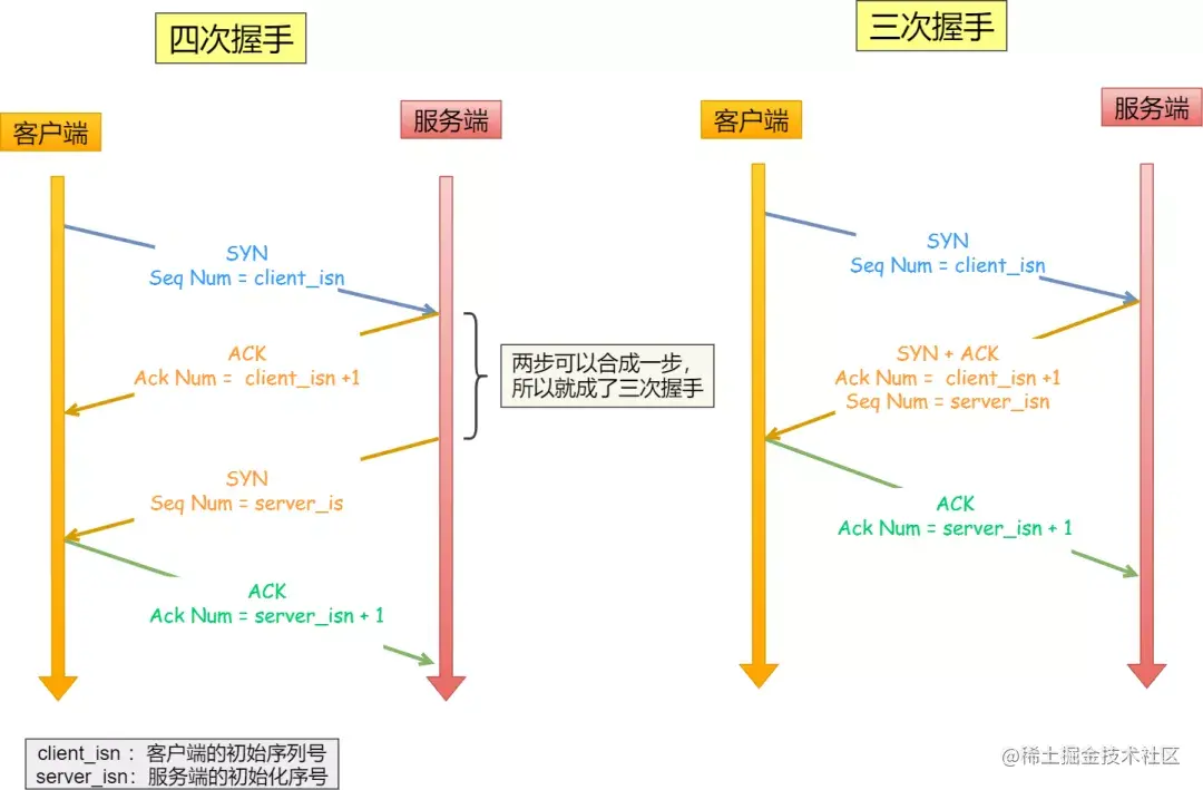 四次握手其实也能够可靠的同步双方的初始化序号,但由于第二步和第三步可以优化成一步,所以就成了「三次握手」。