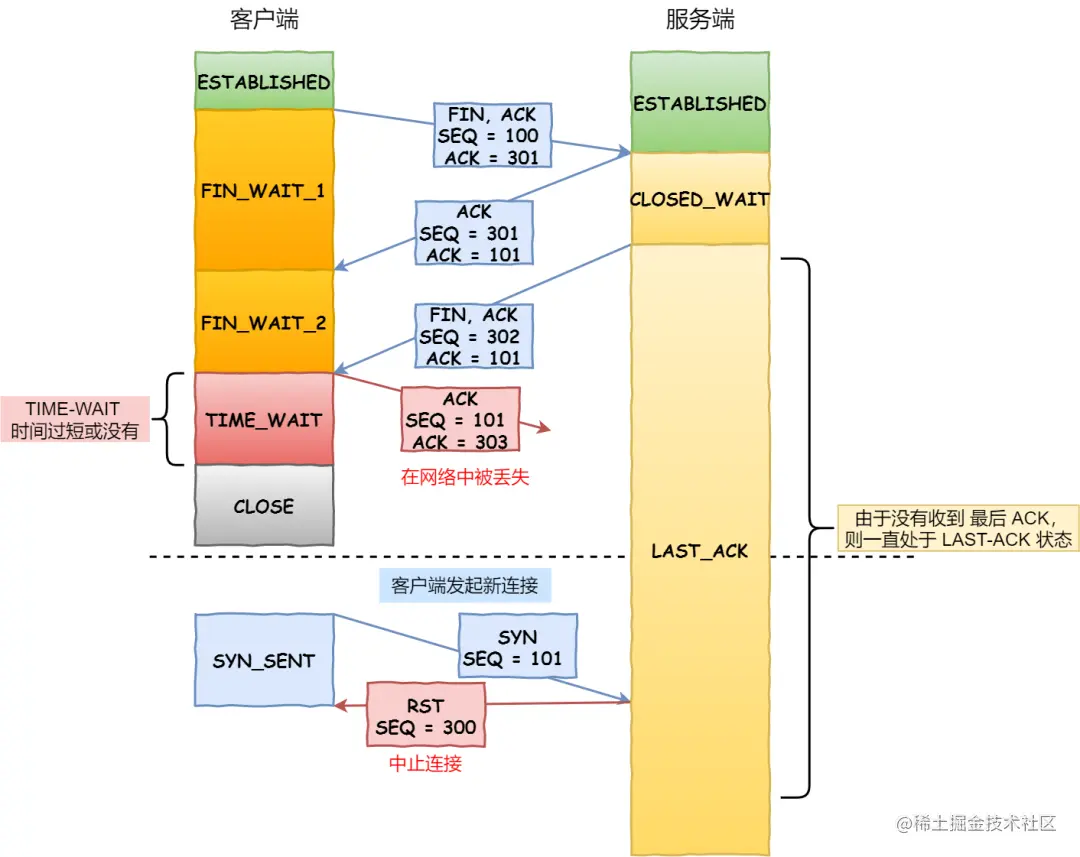 ACK报文如果在网络中被丢失了,此时如果客户端TIME-WAIT过短或没有,则就直接进入了CLOSE状态了,那么服务端则会一直处在LASE-ACK状态。 - 当客户端发起建立连接的