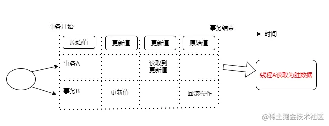- **脏读:**读到了其他事务还未提交的数据,事务A读取了事务B更新的数据,然后B回滚操作,那么A读取到的数据是脏数据