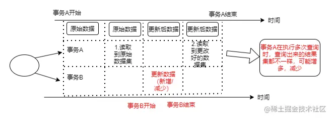 幻读(重点是新增、删除): 在一个事务中,先后进行两次相同的读取(一般是范围查询),由于另一个事务新增或删除了数据,导致前后两次结果不一致