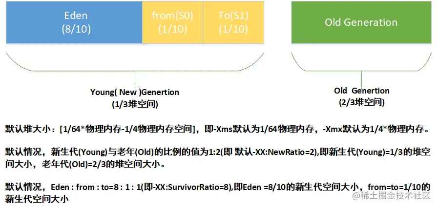 在 Java 中,堆被划分成两个不同的区域:新生代 ( Young )、老年代 ( Old )。新生代 ( Young ) 又被划分为三个区域:Eden、From Survivor(S0)、To Survivor(S1)。如图所示: