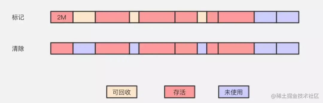 标记-清除算法采用从根集合进行扫描,对存活的对象对象标记,标记完毕后,再扫描整个空间中未被标记的对象,进行回收,如上图所示。标记-清除算法不需要进行对象的移动,并且仅对不存活的对象进行处理,在存活对象比较多的情况下极为高效,但由于标记-清除算法直接回收不存活的对象,因此会造成内存碎片。