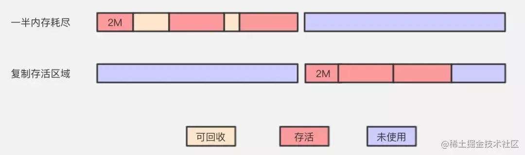 该算法的提出是为了克服句柄的开销和解决堆碎片的垃圾回收。建立在存活对象少,垃圾对象多的前提下。此算法每次只处理正在使用中的对象,因此复制成本比较小,同时复制过去后还能进行相应的内存整理,不会出现碎片问题。但缺点也是很明显,就是需要两倍内存空间。
