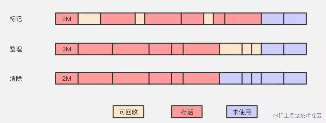 标记-整理算法采用标记-清除算法一样的方式进行对象的标记,但在清除时不同,在回收不存活的对象占用的空间后,会将所有的存活对象往左端空闲空间移动,并更新对应的指针。标记-整理算法是在标记-清除算法的基础上,又进行了对象的移动,因此成本更高,但是却解决了内存碎片的问题。在基于Compacting算法的收集器的实现中,一般增加句柄和句柄表。