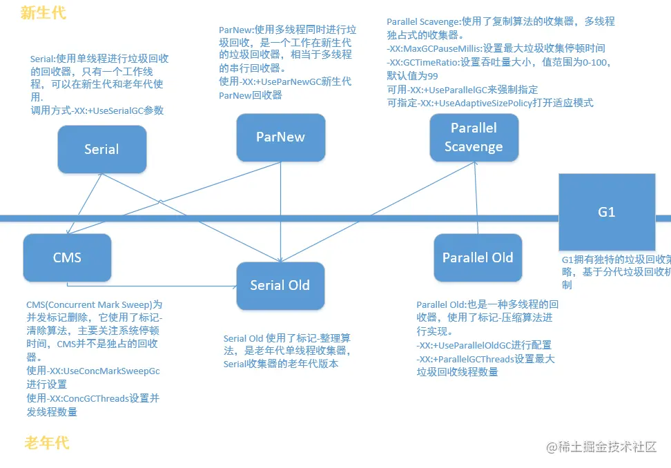 垃圾回收器的任务是识别和回收垃圾对象进行内存清理,不同代可使用不同的收集器: