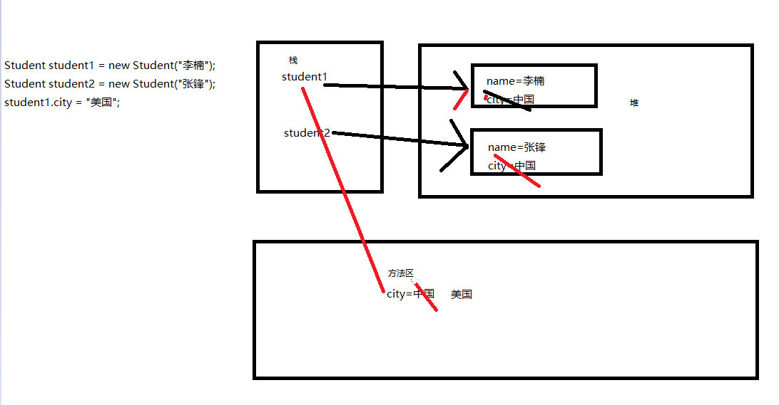 public class Student { String name; static String city = "中国"; public Student(String name) { this.name = name; } } public class Mainstatic { public static void main(String[] args) { Student student1 = new Student("李楠"); Student student2 = new Student("张锋"); student1.city = "美国"; System.out.println(student1.city);//美国 System.out.println(student2.city);//美国 } }