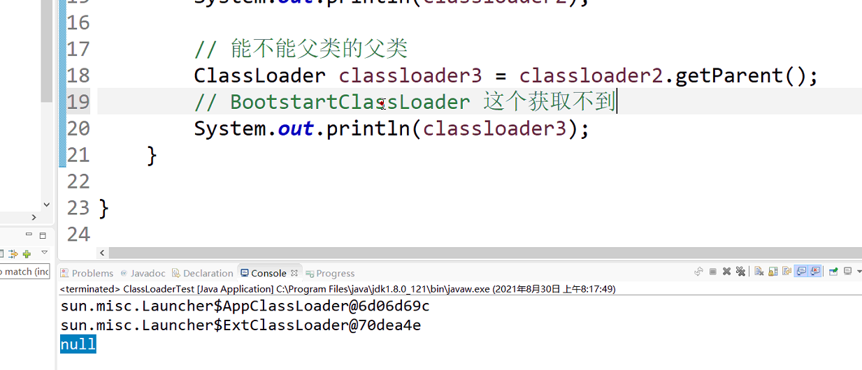 2、bootstarp这个顶层加载器,无法在程序中获取到,只能得到null