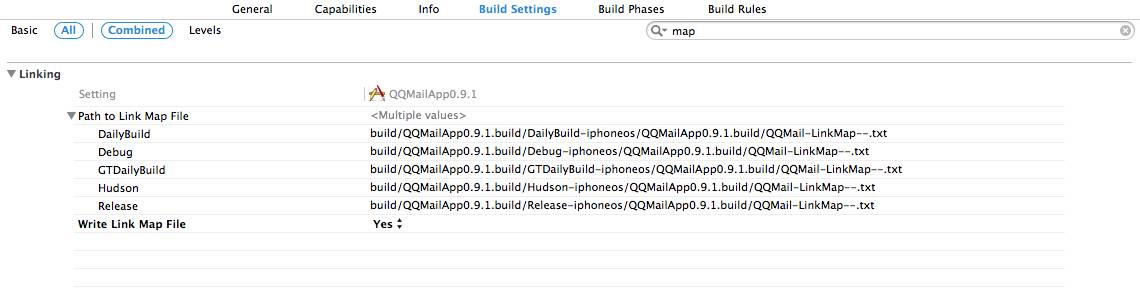 XCode -> Project -> Build Settings -> 搜map -> 把Write Link Map File选项设为yes,并指定好linkMap的存储位置: