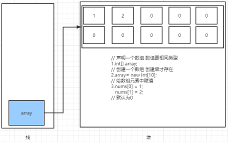 nums = new int[10]; // 创建一个数组 这里面可以存放10个 int 类型的数字