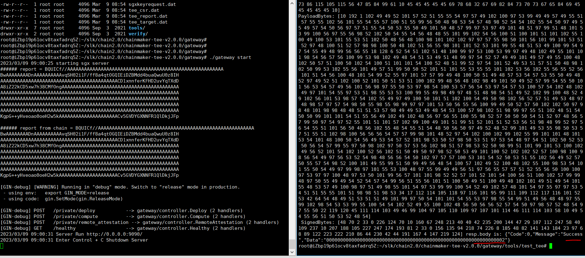 ./cmc tee upload_report --sdk-conf-path=./testdata/sdk_config.yml --report=/root/slk/chain/chainmaker-tee/gateway/out_report.dat ./cmc tee upload_ca_cert --sdk-conf-path=./testdata/sdk_config.yml --ca_cert=/root/slk/per_ca/cacert/CAcert.pem - 启动gateway,运行chainmaker-tee-v2.0.0/gateway/tools/test_tee下的call_tee.go,打印出success,启动成功