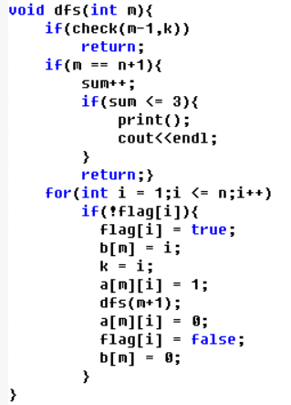 我开了一个布尔的flag数组用于判断每列是否已经放过了皇后,然后再递归不同的行,保证了在不同的行处放的皇后也会位于不同的列。同时由于题目要求输出前三个解,于是我就开了一个整形的b数组用于存放每一种方案的列数。具体的代码如下: