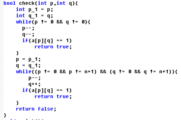 我的思路是他每放一个皇后,我们就进行一次检查,检查这次放的皇后的斜线攻击范围内是否有其他别的皇后,如果有,则需要return,如果没有,则可以放在那里。于是我写了check函数,每放一个皇后,我都会把那个皇后的坐标传给check函数