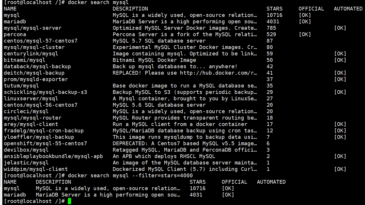 [root@localhost /]# docker search mysql --filter=stars=4000
