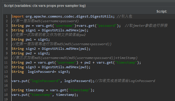 5、在BeanShell编写加密过程,大家应该都能看到,比较简单的逻辑