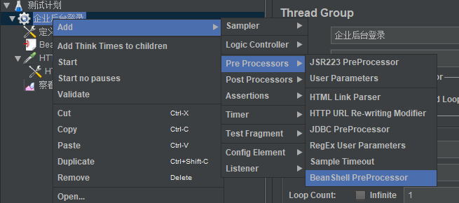 4、因登录密码是通MD5进行多次组合加密,故需要用到BeanShell管理器,在线程组加一个BeanShell