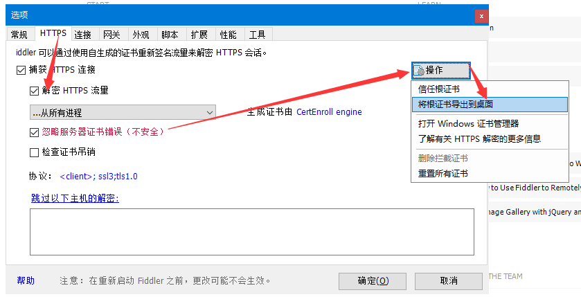 点击HTTPS,勾选Decrypt HTTPS traffic和Ignore server certificate(unsafe)