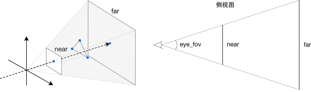 由main函数的代码可知框架定义的near、far面值为0.1、100:r.set_projection(get_projection_matrix(45, 1, 0.1, 100));