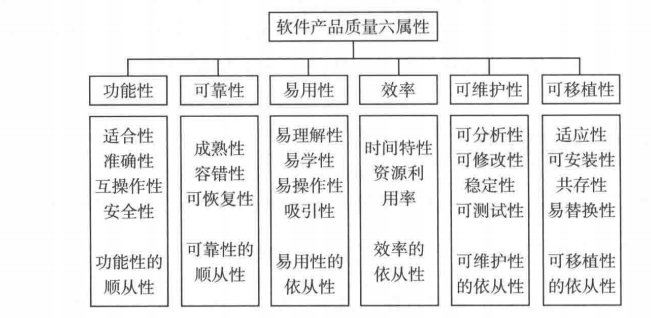 软件产品的质量模型主要表现在6个方面:功能性、可靠性、易用性、效率、可维护性、可移植性