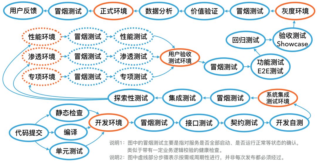 在交付流程方面,一个显著的变化是测试环境种类增多。出于不同的用途和目的,工程师们设计出了各式各样的专用测试环境。这些测试环境的组合形成了各个企业独具特色的交付流程。下图展示了一种用于大型项目的复杂交付流程。
