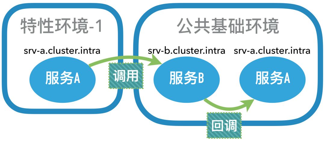 咋看起来,这不就是动态修改域名对应的路由地址、或者消息主题对应的投递地址么?实事并没那么简单,因为不能为了某个特性环境而修改公共基础环境的路由,所以单靠正统路由机制只能实现单向目标控制,即特性环境里的服务主动发起调用能够正确路由,若请求的发起方在公共基础环境上,就无法知道该将请求发给哪个特性环境了。对于HTTP类型的请求甚至很难处理回调的情况,当处于公共基础环境的服务进行回调时,域名解析会将目标指向公共基础环境上的同名服务。