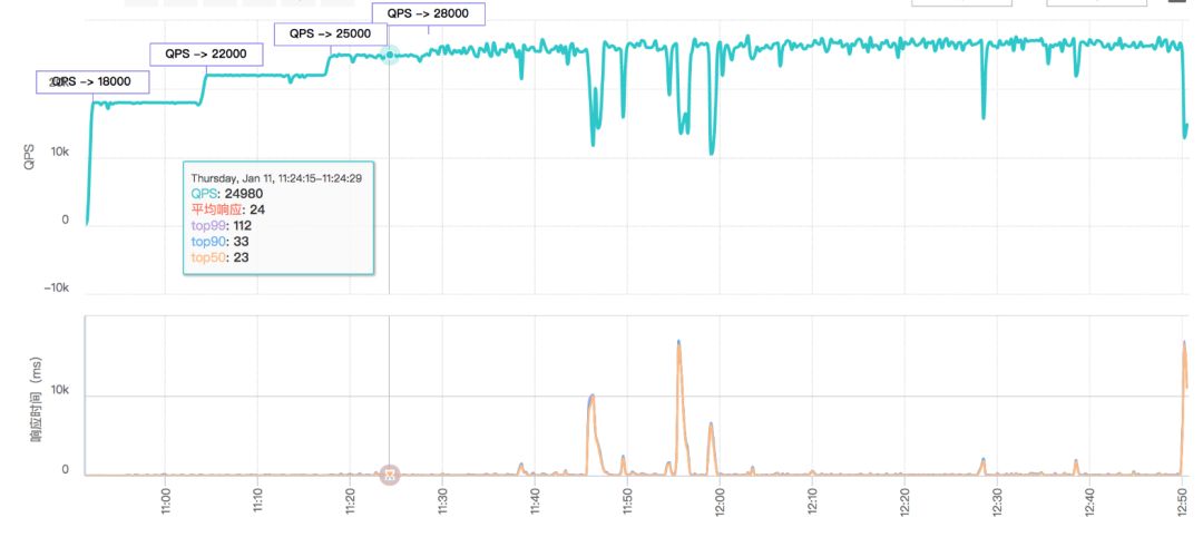 压测引擎另一个重要的指标是 Full GC 的时间,因为如果引擎频繁出现 Full GC,那会造成实际压测曲线(QPS)的抖动,这种抖动会放大被压服务真实的响应时间,造成真实 QPS 在预设值的上下波动。严重的情况,如果是长时间出现 Full GC,直接就导致预压的 QPS 压不上去的问题。